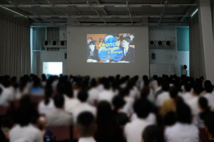 英明タワー8階にて学校紹介動画や代表生徒の話で英明高校について知っていただいた後、校内を簡単にご案内しました。