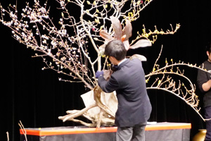 2人は背が高くて重い竹を立てることに挑戦し、花器が倒れるというハプニングにもめげず、竹を中心にツバキや南天を効果的に配置して作品を完成させました。